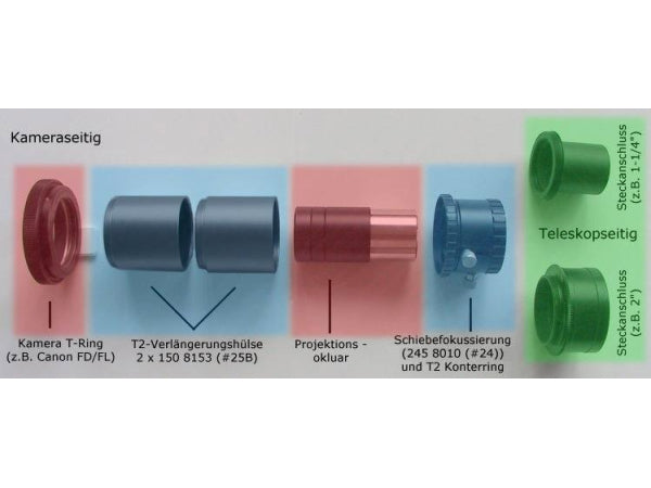 - OPFA VI - Teleskopseitiger Anschluss: Außengewinde M43 x 1, zum Anschluss an alle Vixen-Okularauszüge mit Innengewinde M43 x 1 - Lieferung OHNE Projektionsokular! - Zur Fotografie mit digitalen und/oder analogen Spiegelreflexkameras mit abnehmbarem Objektiv - Bestehend aus Grundversion OPFA (Einzelteile siehe OPFA IV) sowie teleskopseitig mit Vixen-Adapter M43 (#1508037) Okularprojektionsadapter mit M43-Gewinde, variabel. Diese ermöglichen eine Verlängerung der effektiven Teleskopbrennweite. Dieser hat das Vixen-M43-Gewinde und lässt sich in der Länge verändern. Um Mondkrater und Planeten mit hoher Auflösung abzubilden, reicht meist die Brennweite des Fernrohres nicht aus, sie muss verlängert werden. Der OPFA bringt das Okular in den Strahlengang und stellt zusätzlich die Verbindung zum Fernrohr und zum T2-Ring der Kamera her. Der OPFA nimmt Okulare bis zu einem maximalen Gehäusedurchmesser von 38mm auf. Besonders gut sind Plössl-Okulare und orthoskopische Okulare (nach Abbe) geeignet. Der übliche Brennweitenbereich liegt zwischen 6mm und 15mm. Das OPFA System lässt sich komplett auseinanderschrauben. Schieben Sie das Okular einfach in den Schiebefokussierer und fixieren Sie es mit der Rändelschraube. Schrauben Sie danach wieder die beiden T2-Hülsen auf und schon ist der OPFA fertig zum Einsatz. Über den Verschiebemechanismus können sie sogar eine feinfühlige Abstimmung der Vergrösserung erreichen. Je weiter die Kamera vom Okular entfernt ist, desto stärker ist die Nachvergrösserung.