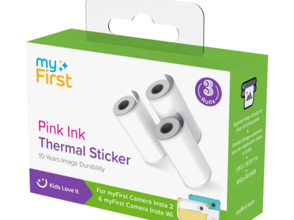 Thermo Sticker weiss mit rosa Tinte für myFirst Camera Insta 2 und myFirst Camera Insta Wi. Hervorragende Bilddichte für klare und scharfe Ausdrucke. Abmessungen: 57mm x 26mm / 3 Rollen à 3 Meter
