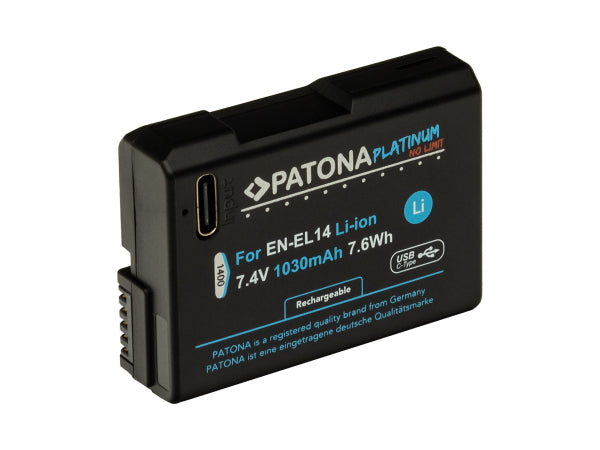 Die Platinum Serie ist die hochwertigste, langlebigste und innovativste Serie aus dem Hause PATONA. Mit dem Kauf eines Akkus aus der PATONA Platinum Serie erwerben sie ein ausgezeichnetes, erlesenes Produkt das sie faszinieren wird. Dieser Akku hat einen USB-C Eingang, sodass dieser auch mit einem USB-C Kabel (im Lieferumfang enthalten) und Netzteil aufgeladen werden kann. Technische Daten: Volt: 7,4V Kapazität: 1030mAh / 7,6Wh USB-C Input: max. 1.2A (Höhere Eingangsströme werden automatisch über IC-Steuerung des Akkus reduziert) mit Lade-LED Zellentyp: Li-Ion Der Akku ist passend für folgende Kamera Modelle: Nikon D3100 / D3200 / D3300 / D3400 D5100 / D5200 / D5300 / D5500 / D5600 Df CoolPix P-Serie P7000 / P7100 / P7700 / P7800 Bezeichnung der kompatiblen Original-Akkus: Nikon EN-EL14 Lieferumfang: PATONA Platinum Akku für Nikon EN-EL14 60cm USB Kabel (USB-A auf USB-C)