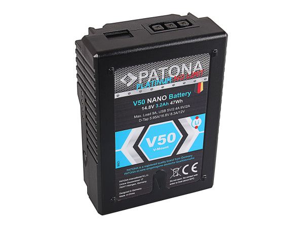 Die neuen PATONA NANO V-Mount Akkus verfügen über eine circa 30%ige kleinere Bauform bei höheren Leistungsdaten im Vergleich zu normalen V-Mount Akkus. Zudem wurde auf ein ansprechendes und modernes Design Wert gelegt. Über eine 4-stufige LED-Anzeige haben Sie jederzeit die verbleibende Kapazität im Blick. Der P-Tap / D-Tap Ausgang kann für Lampen und viele andere externe Geräte verwendet werden. Zudem können über den USB-Ausgang z.B. Smartphone und Tablet aufgeladen werden. Technische Daten: Spannung: 14,8 Volt Kapazität: 3200mAh / 47Wh Zellentyp: Li-Ion Anzahl der Zellen: 4 x 18650 LG Max. Belastbarkeit: 9A Überladungsschutz: 10A P-Tap/D-Tap Ausgangsspannung: max. 100W, 12.0V/8,3A / 16,8V/5,95A USB-Anschluß: Normalmodus 5V/2,4A / Schnellademodus: 9 V/2A Maximal Gewicht: 316 gr Größe: 75 x 105 x 34mm Marke: PATONA Platinum Der Akku ist passend für folgende V-Mount Kameratypen: Sony Sony DSR 250P, 600P, 650P, 652P HDW 800P PDW 850 DSR-250P, DSR-600P, DSR-650P, DSR-652P, HDW-800P, PDW-850, V-Mount Dieser Akku ersetzt folgende Originalakkus: Sony BP150w, BP-150w, BPFL75, BP-FL75, BPFLX75, BP-FLX75, BPL40A, BP- L40A, BPL60, BP-L60, BPGL65, BP-GL65, BPGL95, BP-GL95, BPGL95A, BP- GL95A, RED V-mount / Bebob Vcine Akkus V155RM-CINE