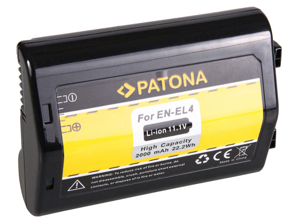 kompatibler PATONA Li-Ionen Akku Nikon EN-EL4 High capacity - 2000 mAh / 22.2 Wh / 11,1V passend für folgende Kameratypen Nikon D2H, D2Hs, D2X, D2Xs, D3, D3X, F6 Ersetzt folgende Originalakkus: Nikon EN-EL4, EN-EL4a Wissenswertes: Mit diesem Li-Ionen-Akku Nikon EN-EL4 erwerben Sie ein Qualitätsprodukt der Marke PATONA. Alle Akkus sind nach höchsten europäischen Qualitätsstandards hergestellt und zeichnen sich durch extreme Langlebigkeit aus.