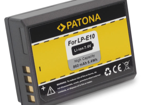 Kompatibler PATONA Akku für Canon LP-E10 hochwertiger Li-Ionen Akku für Canon LPE10 High capacity - 860 mAh / 6,4 Wh / 7,4V Der Akku ist passend für folgende Modelle: EOS 2000D, EOS 4000D, EOS 1200D. EOS 1100D, EOS 1300D Original-Bezeichnung der Canon Akkus Dieser Akku ersetzt folgende Akkutypen: Canon LP-E10 sowie überall dort, wo der LPE10 noch paßt. it diesem Li-Ionen-Akku LPE10 erwerben Sie ein Qualitätsprodukt der Marke PATONA. Der Akku Canon LPE10 ist 100% baugleich zu dem Original Akku. Alle Akkus sind nach höchsten europäischen Qualitätsstandards hergestellt und zeichnen sich durch extreme Langlebigkeit aus. Zudem haben unsere Akkus höchste Zyklenfestigkeit, was eine hohe Anzahl möglicher Lade- Entlade-Zyklen bedeutet. Die geringe Selbstentladung der Akkus sorgt bei Nichtgebrauch für geringen Energieverlust. Die kompatiblen Nachbau-Akkus besitzen Sicherheitsvorkehrungen wie bspw. Überhitzungsschutz und können natürlich mit Ihrem Original- Netzteil aufgeladen werden.