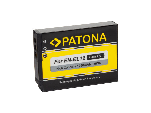 Li-Ionen Akku; 1050mAh / 3.7V / 3,9Wh Der Akku ist passend für folgende Modelle: Nikon CoolPix P300, S70, S710, S610, S610c, S620, S630, S640, S800 S1000pj, S6100, S6200 S6300, S8000, S8100, S8200, S9100, S9300 S9400, S9500, S9600, S9700 KeyMission 170/360, W300,A900,S9900, Aw100, AW110, Aw120, AW130, 300, P310, P340, P330 und überall wo der EN-EL12 noch passt. Hohe Sicherheit durch integrierten Hitze- und Überladeschutz; 100% kompatibel mit dem originalen Akku EN-EL12; Der Akku ist mit Markenzellen der Güteklasse A bestückt, die eine extrem hohe Dichtigkeit aufweisen. Dies trägt zu sehr langen Laufzeiten des Akkus bei;Ein Höchstmaß an Sicherheit wird durch permanente Qualitätskontrollen in den Produktionsstätten vor Ort gewährleistet;Das Original-Ladegerät kann zum Laden des Akkus verwendet werden;Bei dem Akku handelt es sich um ein hochwertiges Nachbauprodukt der Marke PATONA - kein Original.
