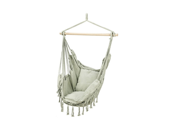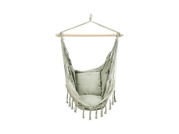 Produktinformationen, , Holz und Stoff, Strapazierfähiges und wetterfestes Textilgewebe, Ideal für Garten, Balkon, Terrasse und Innenbereich, Modern und gemütlich, Sehr komfortable Sitzfläche, Befestigung an einem stabilen Punkt, z. B. einem Ast oder Haken, Perfekt zum Entspannen, Lesen oder Schlafen, Leicht zu reinigen und pflegeleicht, Für den Aussenbereich geeignet, widerstandsfähig gegenüber Witterungseinflüssen