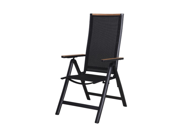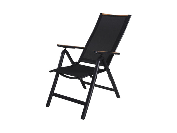 Dieser Gartenstuhl mit Lehne in ansprechender Holzoptik fügt sich perfekt in jede Aussenumgebung ein. Mit Abmessungen von 58 x 71 x 111 cm bietet er einen komfortablen Sitzplatz für entspannte Stunden im Freien., , Dieser Stuhl ist nicht nur bequem, sondern auch äusserst praktisch: Dank seiner klappbaren Konstruktion ist er platzsparend verstaubar und lässt sich mühelos zusammenklappen. Somit ist er ideal für kleinere Terrassen oder Balkone geeignet., , Die Witterungsbeständigkeit dieses Gartenstuhls macht ihn zu einem zuverlässigen Begleiter in jeder Jahreszeit. Seine Rückenlehne ist 5-fach verstellbar, sodass du die perfekte Sitzposition für maximalen Komfort finden kannst., , Die Armlehnen und die obere Leiste des Stuhls sind mit einer edlen Nonwood-Verkleidung versehen, die nicht nur stilvoll aussieht, sondern auch langlebig ist. Das Gestell besteht aus Aluminium und Kunststoff, während die Sitzfläche aus strapazierfähigem 2-in-1-Textilene-Material gefertigt ist., , Geniesse entspannte Stunden im Freien mit diesem eleganten und funktionalen Gartenstuhl!, , , Produktinformation, , Gartenstuhl mit Lehne in Holzoptik, klappbar, Masse: 58 x 71 x 111 cm, Platzsparend verstaubar, zusammenklappbar, Witterungsbeständig, 5-fach verstellbarer Rückenlehne, Armlehnen und obere Leiste in edler Nonwood Verkleidung, Material: Gestell - Aluminium, Kunststoff, Sitzfläche 2in1 Textilene