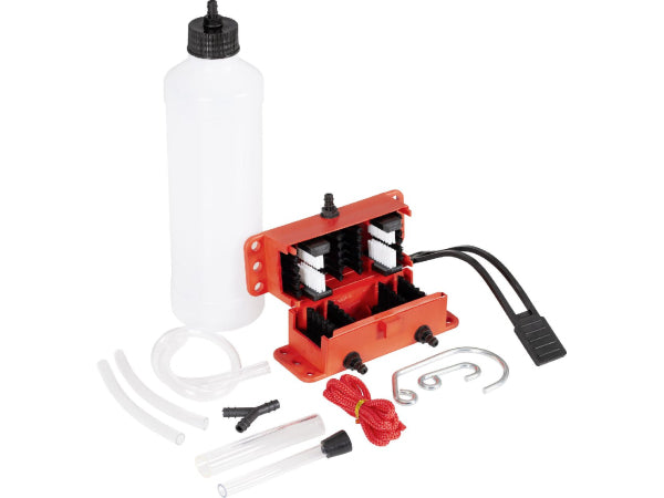 Kettenmax, diverse Schläuche und Adapter für Spraydosen, Pumpflasche zum selber Befüllen sowie eine ausführliche Bedienungsanleitung. Kettenreiniger bitte separat bestellen.
