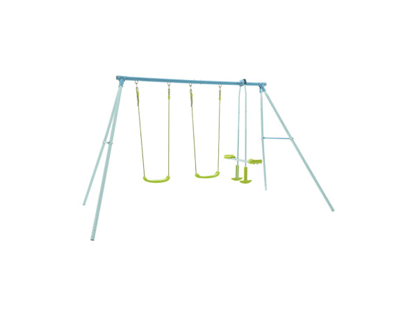 Dieses coole Schaukelset bringt jede Menge Spass für die Kleinen. Mit zwei Schaukelsitzen und einer zweisitzigen Wippschaukel können bis zu vier Kinder gleichzeitig schaukeln, wippen und lachen. Dank höhenverstellbarer Sitze wächst das Set einfach mit. Perfekt für kleine und grössere Abenteurer. Das stabile, pulverbeschichtete Stahlgestell sorgt für sicheren Halt, während die bequemen, spritzgegossenen Sitze maximalen Komfort bieten. Die frischen Farben sind ein stylischer Mix aus Blau und Limettengrün und machen das Schaukelset zum Hingucker in jedem Garten. Natürlich gibt’s auch Bodenanker für extra Stabilität. Geeignet für Kids von 3 bis 10 Jahren, mit einem max. Gewicht von 50 kg pro Sitz. Also, los geht’s – rein in den Garten und ab ins Schaukelvergnügen., , , Produktinformationen, , Enthält zwei Schaukelsitze und eine zweisitzige Glide Ride Schaukel, Höhenverstellbare Schaukelsitze mit weichen Seilen, Robuste und bequeme, spritzgegossene Sitze, Pulverbeschichteter Stahlrahmen, Inklusive Bodenanker, Empfohlenes Alter: 3–10 Jahre, Maximales Benutzergewicht: 50 kg pro Sitz, Maximal 4 Benutzer gleichzeitig, Aufgebaute Masse: Höhe: 185 cm x Breite: 292 cm x Tiefe: 200 cm